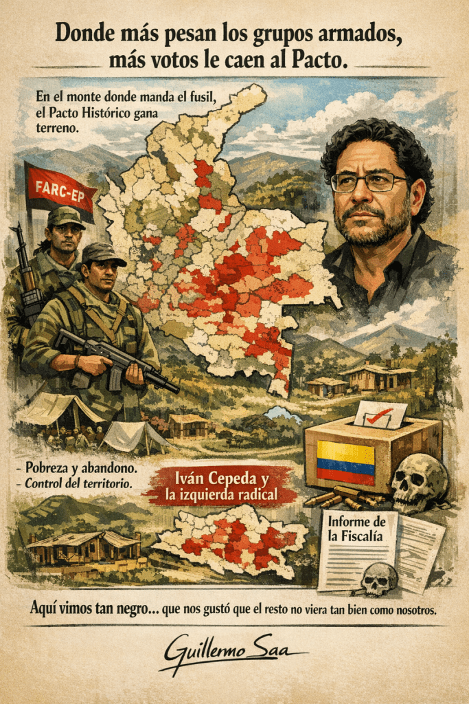 Cuando uno ve los mapas de votación del Pacto Histórico al Congreso, hay algo que nunca se dice pero que se nota como un ruido de fondo, donde más pesa la presencia de grupos armados, más votos le caen al Pacto. No es que en Bogotá, en Medellín o en Cali les vaya mal, pero donde el Estado entra poco, donde el orden subterráneo se impone al oficial, donde el control territorial se juega en el monte y no en el Concejo, el Pacto aparece como el candidato natural.